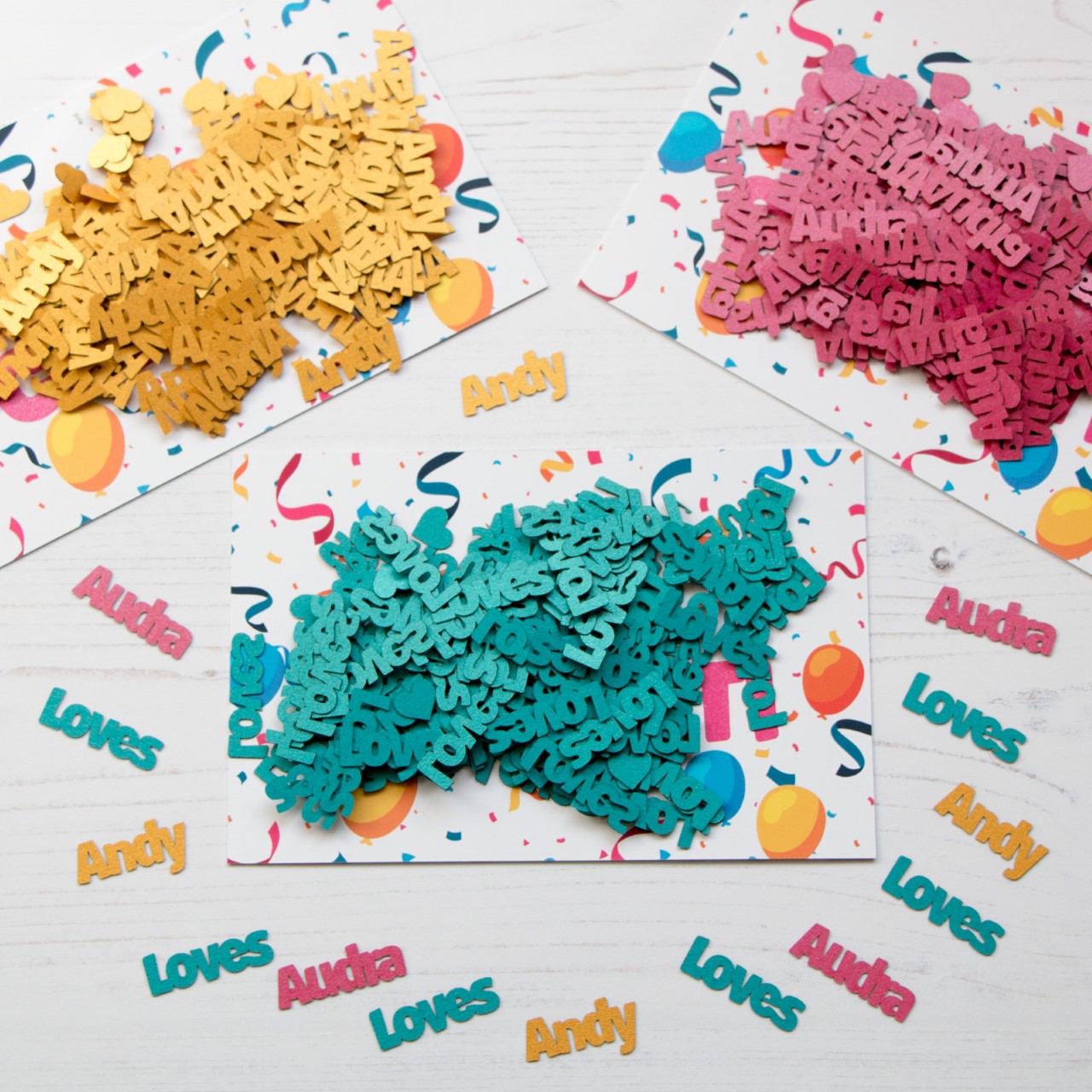 Any words or name on confetti - cut from beautiful biodegradable pearlescent card.